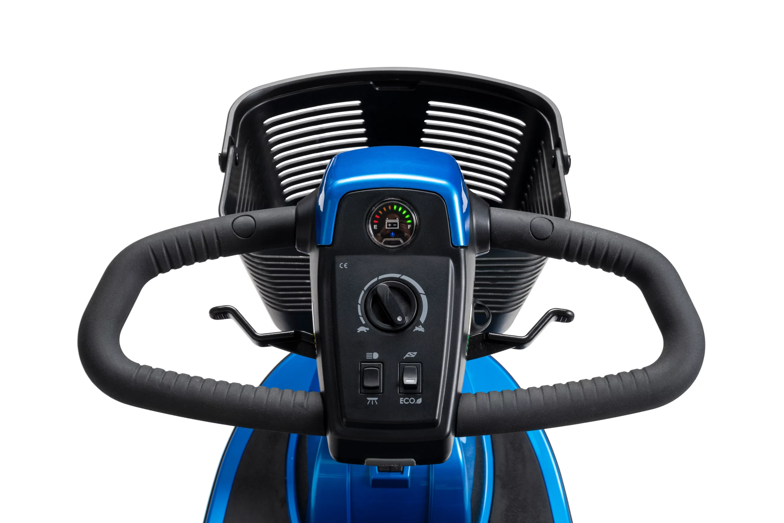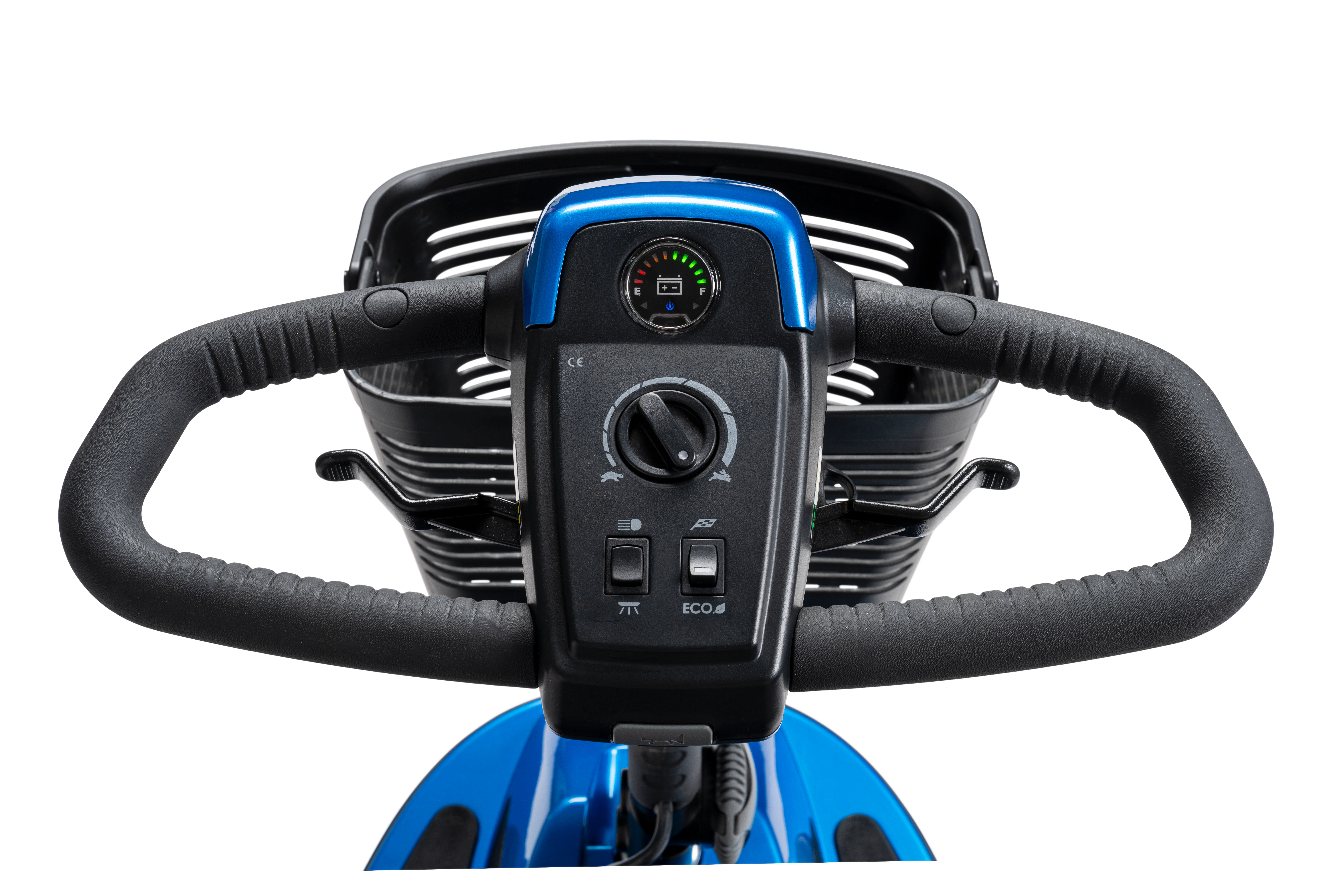- Cockpit mit Akkustandsanzeige und Geschwindigkeitsregler